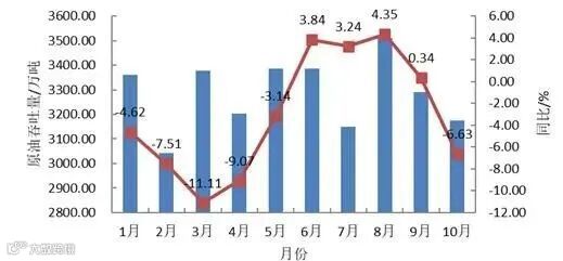 10月,规上工业原油产量1800万吨,同比增长1.3%;1—10月累计1.81亿吨,同比增长1.7%。原油加工量6343万吨,同比增长6.4%;1—10月累计6.14亿吨,同比增长4.0%。原油进口量4835.7万吨,同比增长14.1%;1—10月累计4.71亿吨,同比增长3.1%。