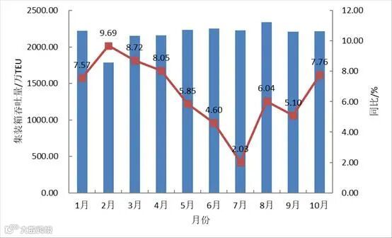 10月,主要沿海内河港口企业完成集装箱吞吐量2689.69万TEU,同比增长7.7%,其中国外贸易吞吐量1377.46万TEU,同比增长13.9%。1—10月累计2.65亿TEU,同比增长6.9%,其中国外贸易吞吐量1.35亿TEU,同比增长10.2%。11家沿海集装箱枢纽港(上港集团、宁波舟山港股份、广州港集团等)10月吞吐量2216.63万TEU,同比增长7.76%;1—10月累计2.18亿TEU,同比增长6.48%。