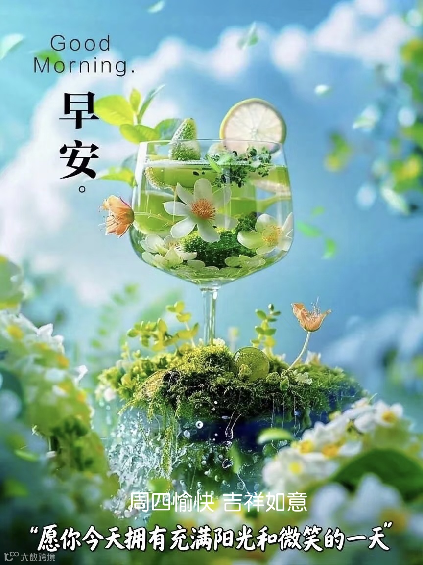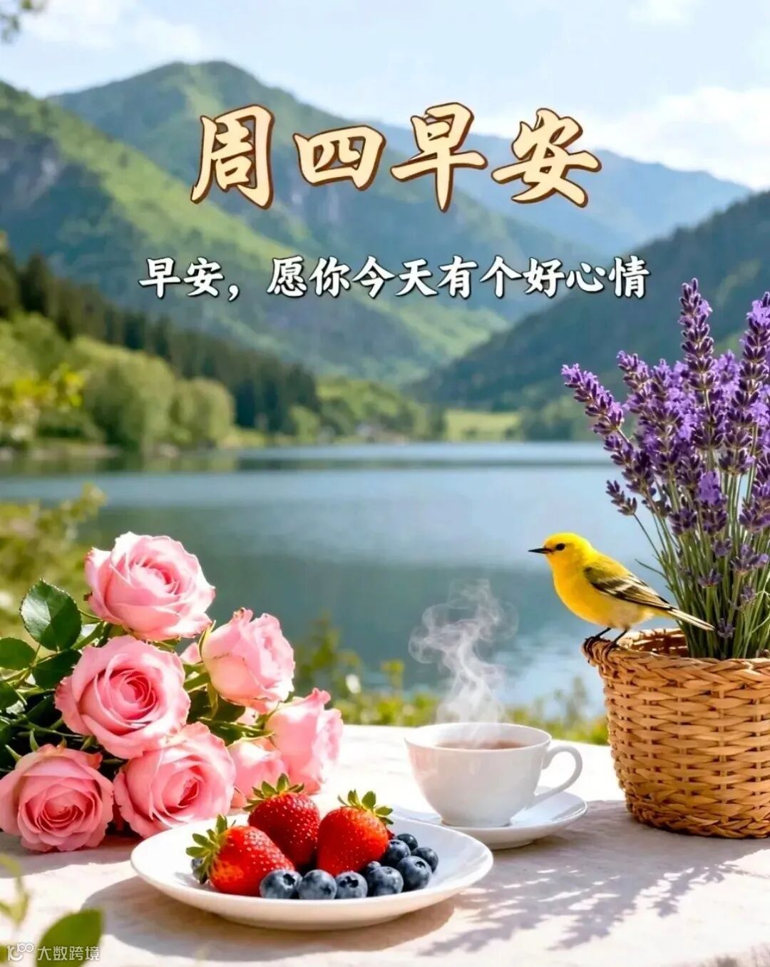 新的一天,愿你带着勇气和坚定,去追逐心中的梦想,去完成未竟的目标。工作再忙,也要记得按时吃早餐;节奏再快,也别忽略了身边的美好。生活向阳,人间向暖,美丽的清晨,美妙的开端,愿每个平凡的日子里,都有细微的美好!祝你心情美丽,一切安好!周四早安!