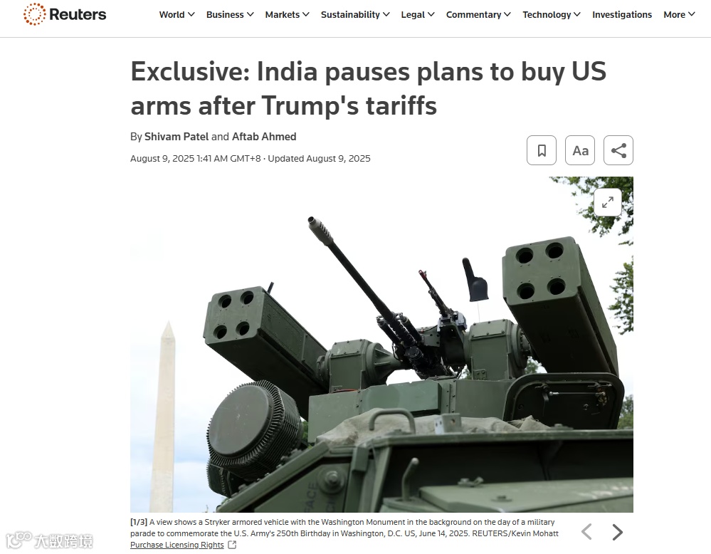 路透社报道,印度已经暂停执行购买美国武器装备的计划,包括“斯特赖克”装甲车、“标枪”反坦克导弹以及6架P-8I反潜侦察机。