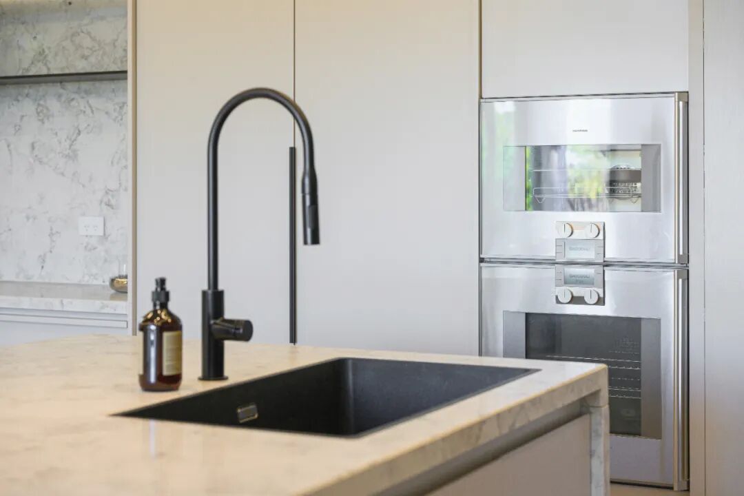 厨房采用 Gaggenau 高端电器组合,搭配天然大理石台面与高挑柜体。