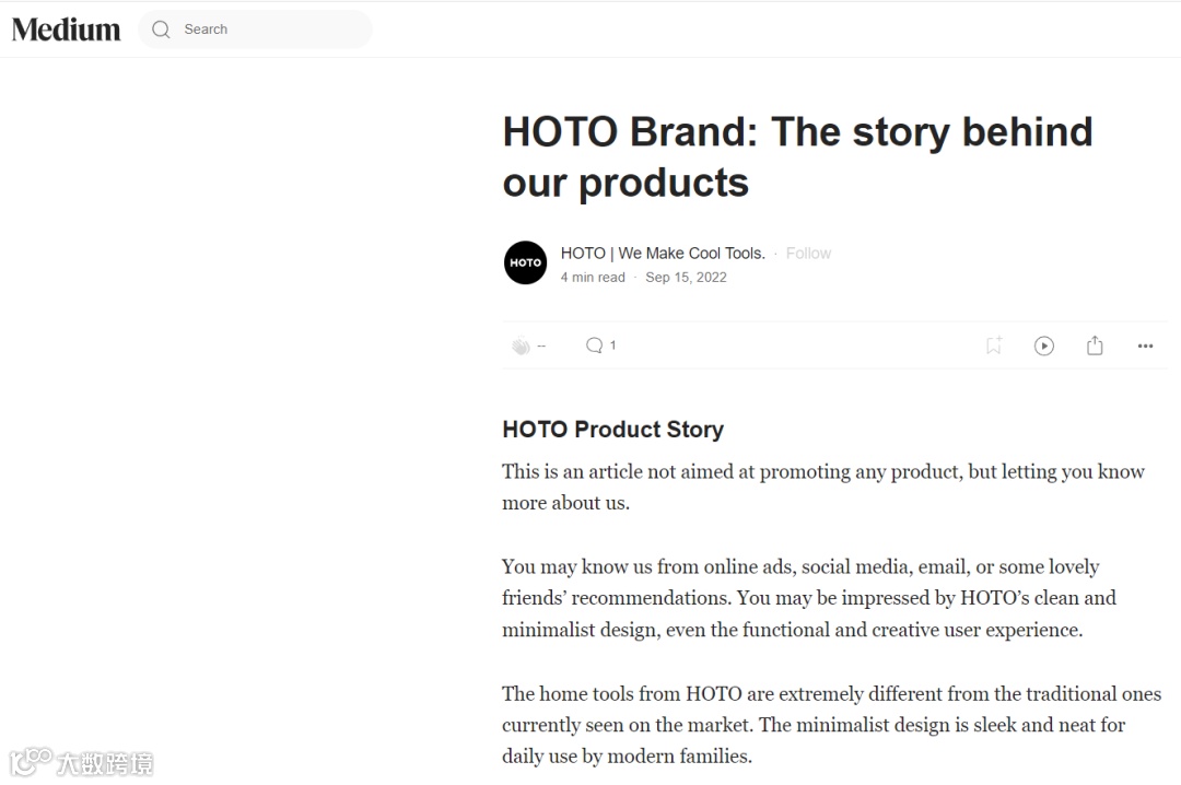 此外HOTO还借助专注故事的博客Medium发布品牌故事稿件,文中直言品牌并不期望通过该稿件获得用户购买转化,旨在于让用户更多了解HOTO的故事。品牌形象类稿件虽不具备强消费导向性,但能更好地在用户潜意识中建立一个真诚、亲和的品牌形象。