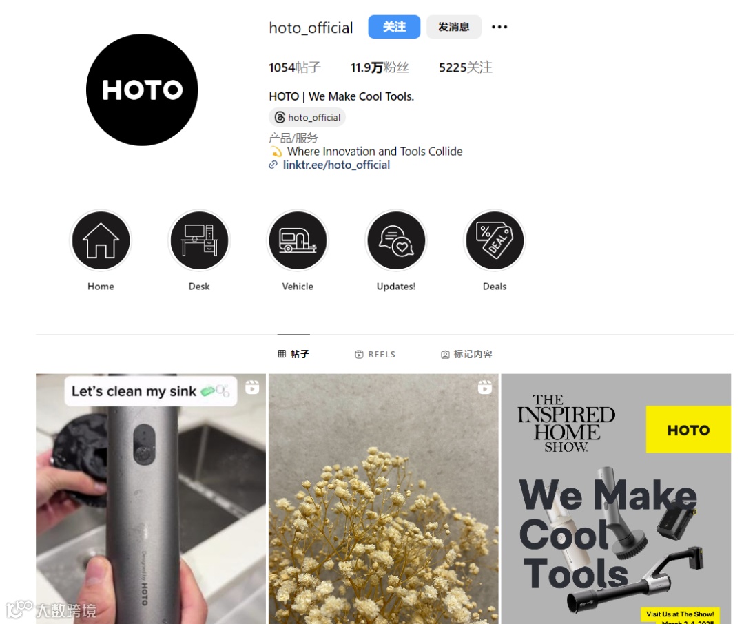 在Ins,HOTO官方账号主要发布品牌活动通知和产品使用短视频。其中电动旋转洗涤器清洁效果极强,收获较佳传播效果。同时配合Ins红人博主合作内容,成功打造了#hototools话题,收获了超过5000条优质帖子和11.9万粉丝。
