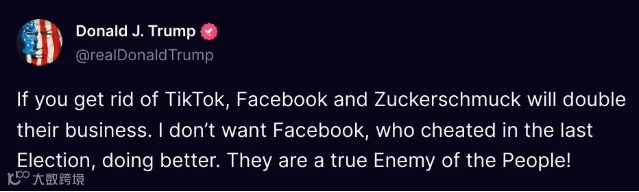 有意思的是,就连特朗普也发表了反对意见,3月7日晚间,这位昔日要封禁TikTok的美国前总统在社交媒体上发帖表示,“要是把TikTok禁了,Facebook和扎克伯格就会扩张商业版图。Facebook可是在上回选举的时候作弊了,他们才是人民真正的敌人!”