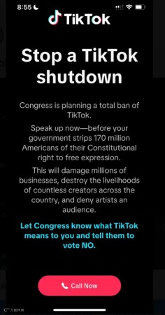 3月7日晚上9点,推特上名为CaiweiC的用户上传了自己打开TikTok时看到的开屏截图。TikTok呼吁用户通过发声来阻止针对TikTok的封禁,“现在就大声说出来……让国会知道TikTok对你的意义,以及告诉他们你反对这项法案。”开屏页面的底部是红色的“打电话”按钮,为用户提供当地的政府代表电话。