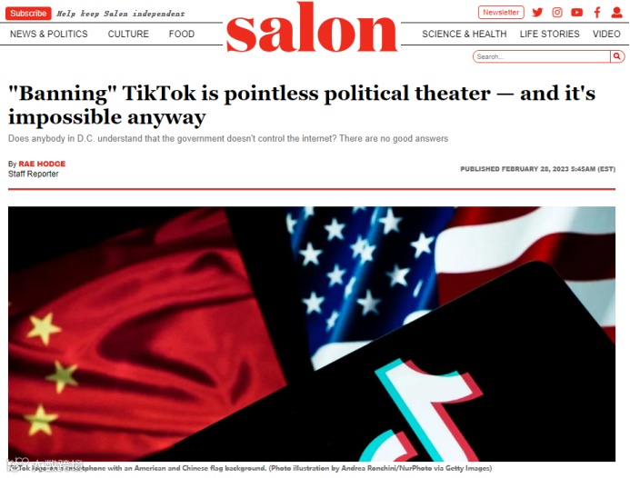 美国政论网站曾发文称“禁用TikTok是毫无意义的政治闹剧”,“禁止所有美国人的个人设备使用 TikTok,不仅在政治上不可信、宪法上可疑,在技术上也是不可能的。”