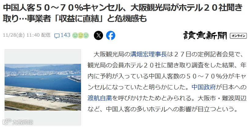 大阪观光局调查显示,其旗下20家会员酒店年底前中国游客预订取消率达50%—70%;难波周边以中文服务为特色的酒店前台从“人声鼎沸”变为“门可罗雀”。