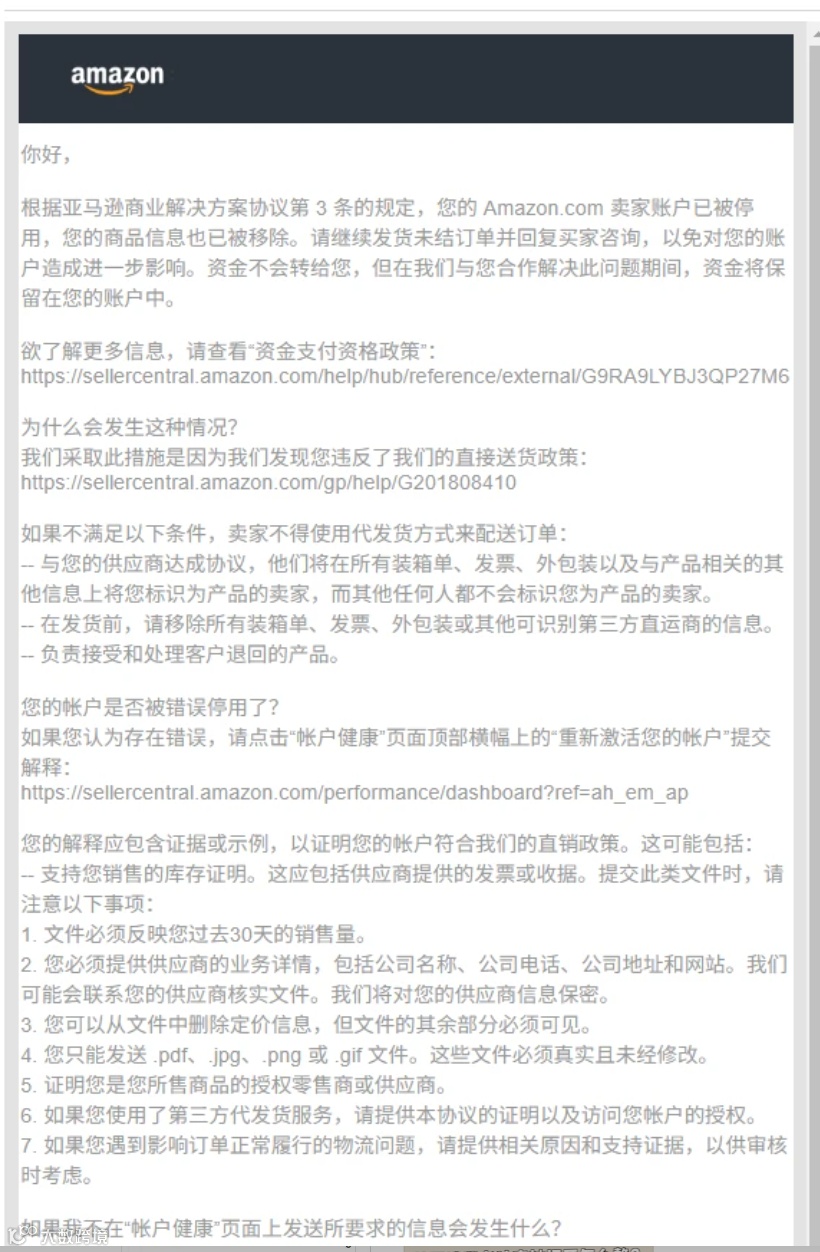收到标题含“Direct fulfillment policy violation/违反直送政策”的邮件,后台显示“自配送商品已被停售”,严重时账户被停用、资金冻结。 -