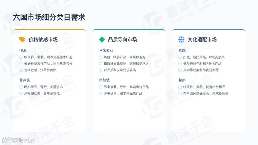 - 印尼:纸尿裤、童装、喂养用品需求旺;偏好轻薄透气、热带适配产品;价格敏感、性价比优先;市场规模最大、竞争最激烈。