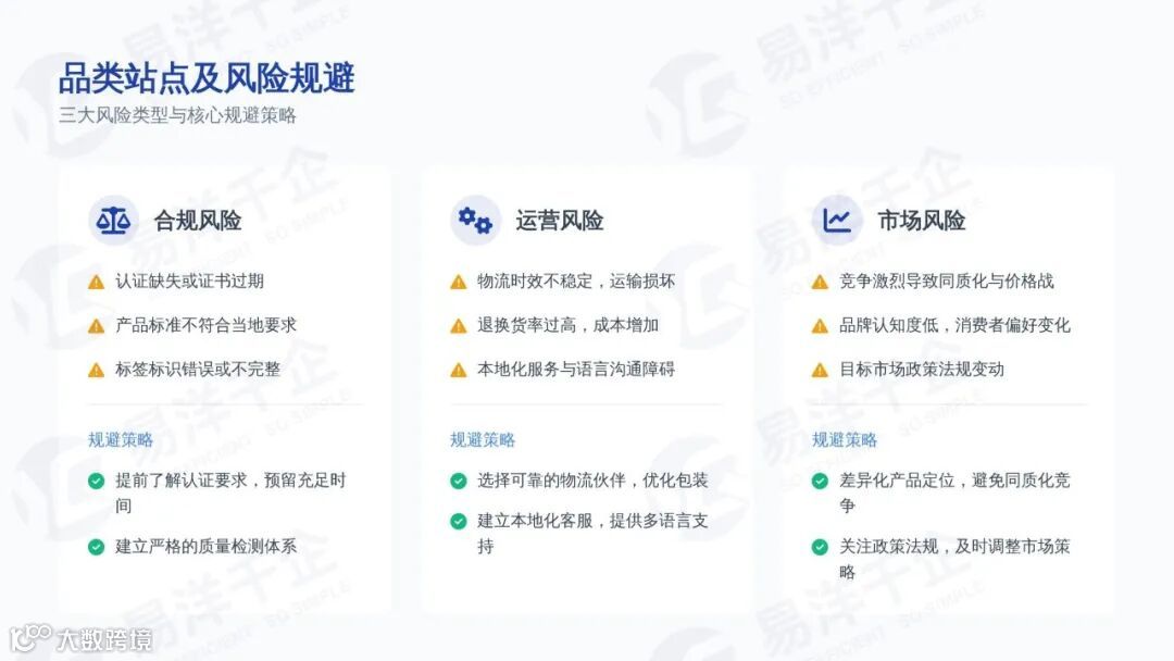 - 规避策略:坚持差异化定位;系统建设品牌资产;动态跟踪法规调整;实施多国市场分散布局。