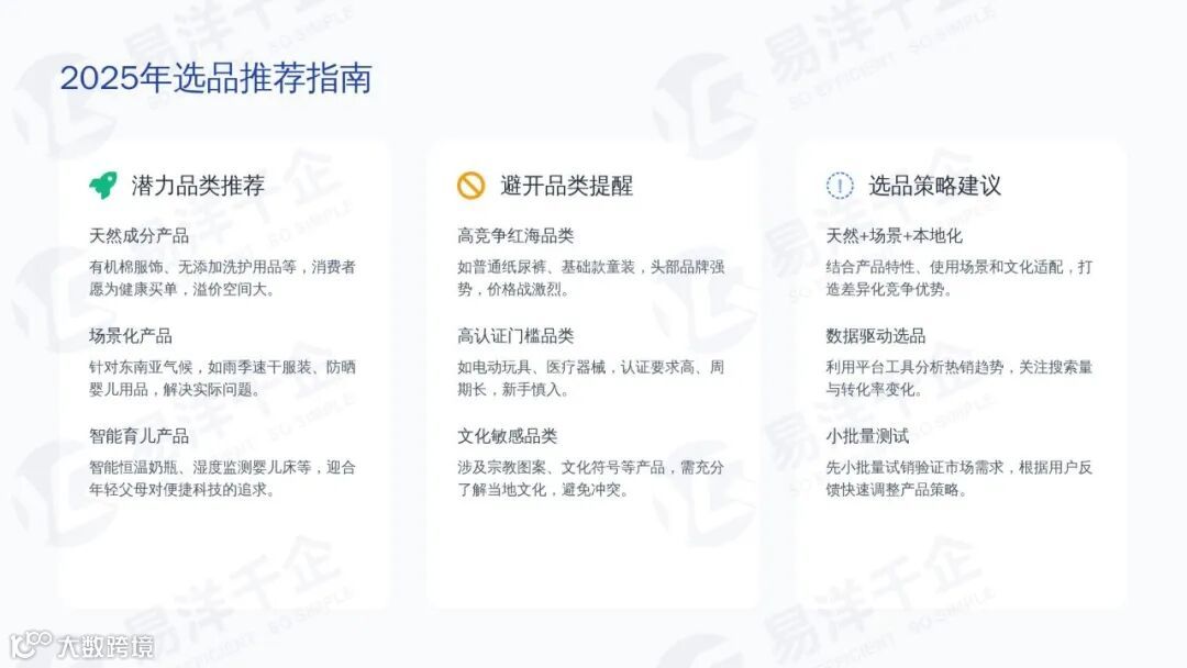 - 场景化产品:雨季速干服装、防晒婴儿用品、便携出行套装;解决实际痛点,但需提前备货应对季节性。