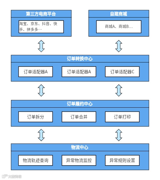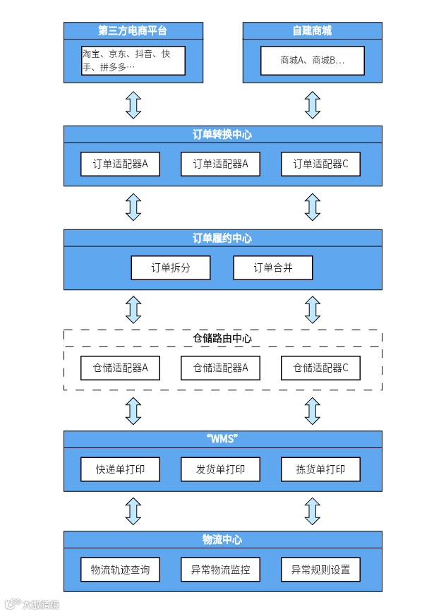 物流中心:也是配送系统,对接“WMS”和物流公司系统。接收“WMS”下发的物流单号,对其进行物流查询和异常监控,并将物流信息收集并回传至“WMS”和订单履约系统。