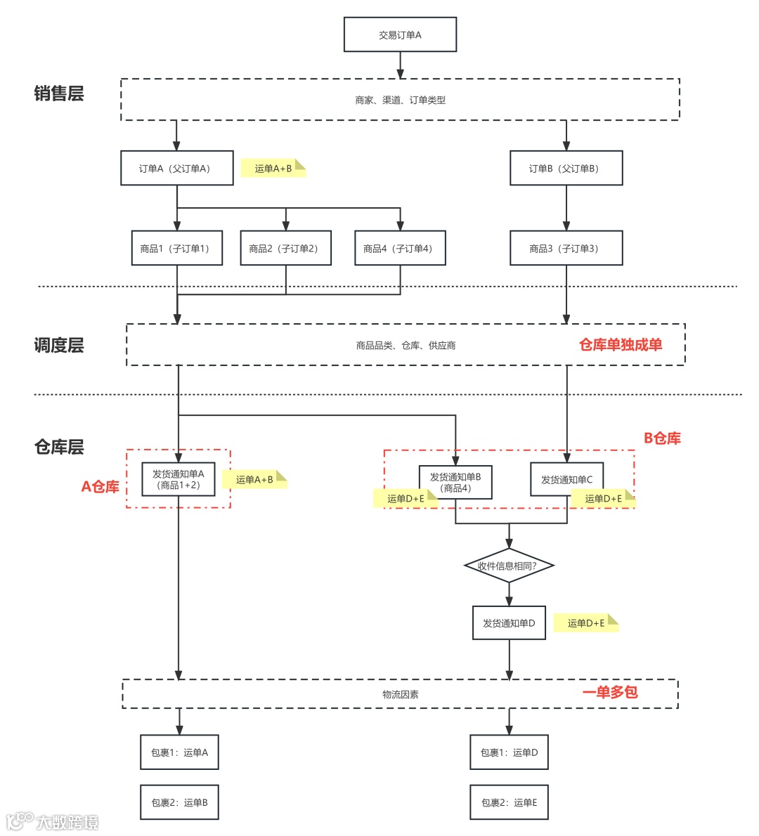 物流因素:根据快递公司的价格,将订单根据重量或体积拆分成多个包裹、代收货款金额快递公司上限、跨境订单出关金额限制、根据上述的维度,我们可以将订单的拆分分成销售层、调度层、仓库层3层去进行。