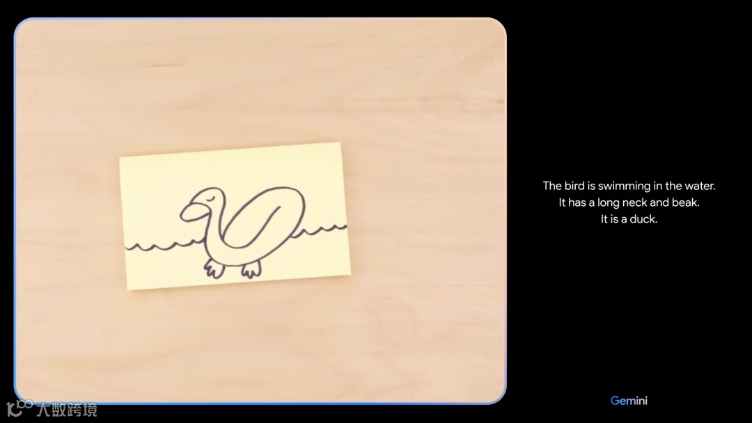 但是当演示人员画上了波浪后,Gemini表示通过长脖子长嘴又会游泳这几个依据,判断这是只鸭子。