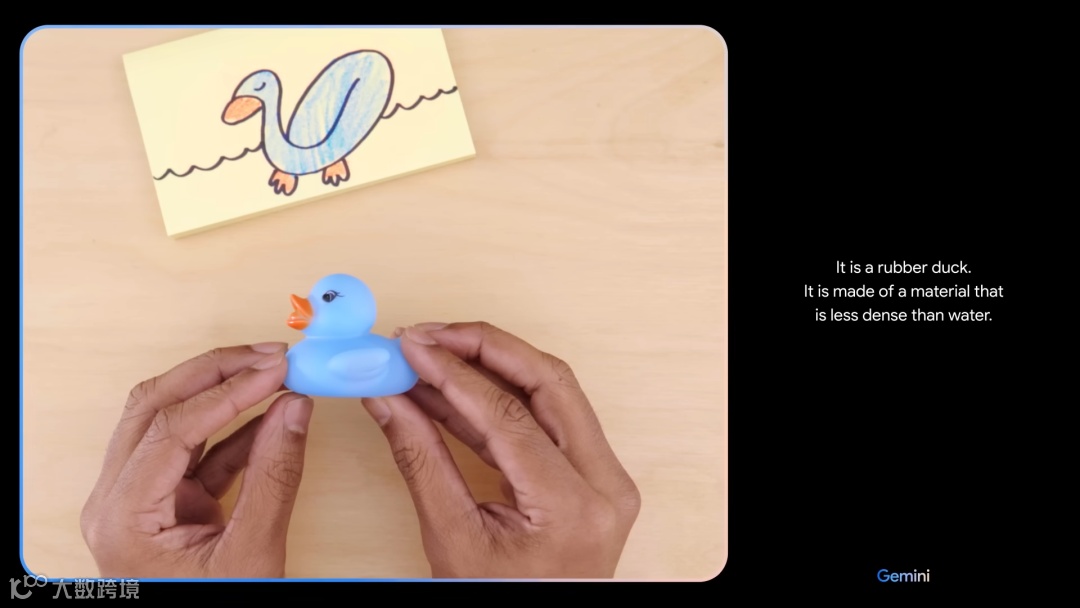随后演示人员拿了个玩具小鸭子问Gemini这个东西是什么材质做的,Gemini表示看起来可能是橡胶也可能是塑料。而当演示人员捏响橡胶鸭子后,Gemini立刻判断出是用柔软的橡胶做成的。