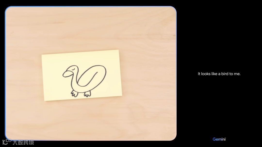 演示视频中,演示人员画了一个类似鸭子的轮廓让Gemini辨认,Gemini表示它觉得像个鸟。
