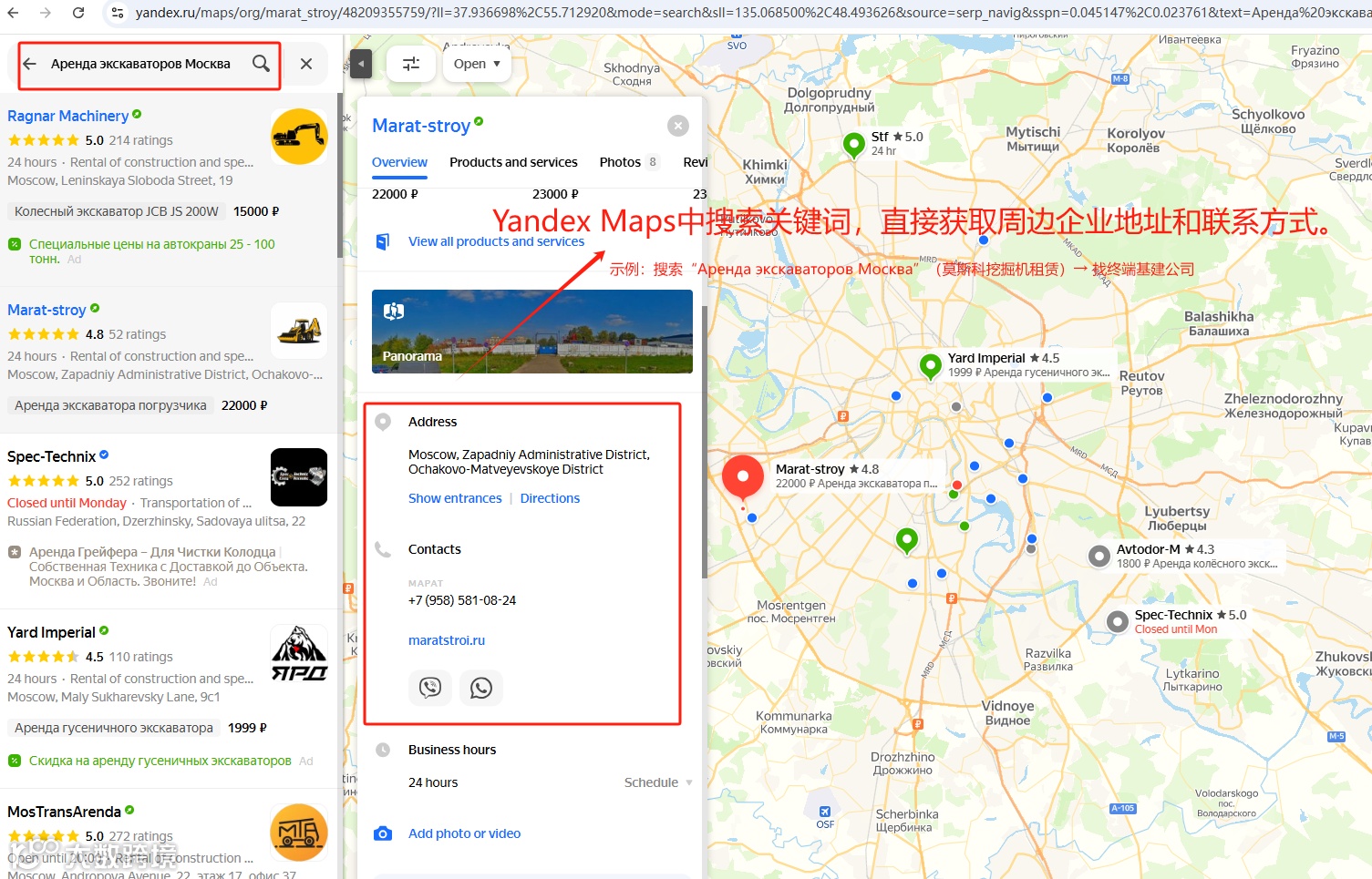 在Yandex搜索结果中,很多企业会留下官网链接或VK主页链接。