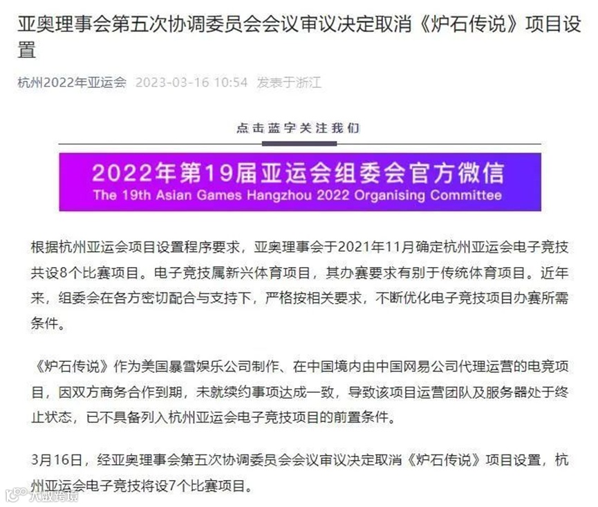 ▲图:亚奥理事会第五次协调委员会会议审议决定取消《炉石传说》项目设置”