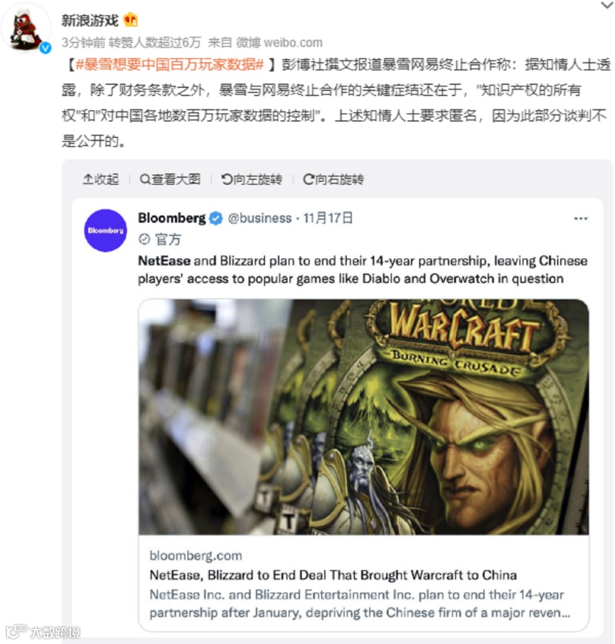▲图:彭博社撰文称暴雪与网易终止合作的关键症结还在于“知识产权的所有权”和“对中国各地数百万玩家数据的控制”