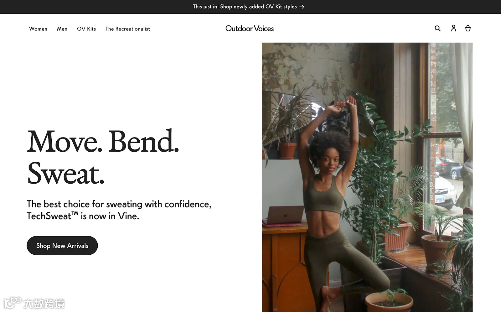 Outdoor Voices’的主页以生活方式图片为特色,传达其品牌美学和理想的生活方式。它专注于有限的字体,以获得干净的外观和清晰的视觉层次。