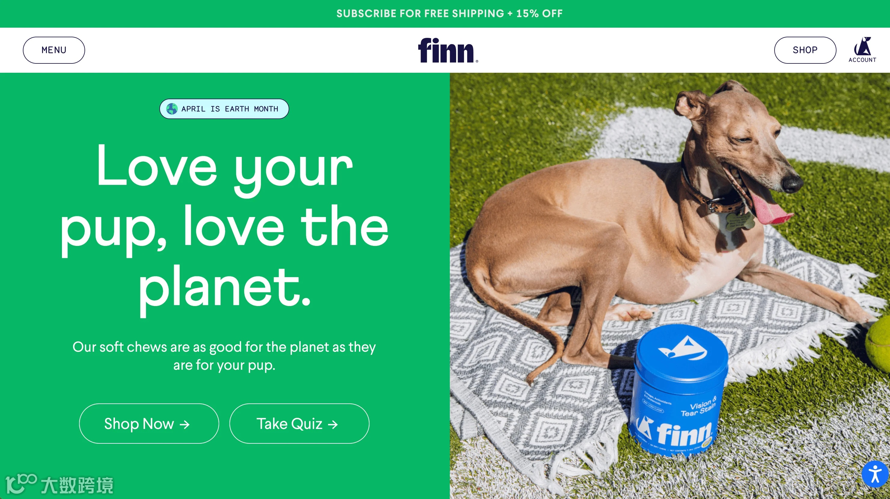 Finn给了宠物主人他们想要的东西:快乐狗狗的大照片,激励他们宠爱自己的狗狗。该品牌的网站也使用了简单的字体,大量的对比和页面层次结构,引导访问者到Shop Now或Take Quiz。互动测试可以帮助顾客对他们的购买更有信心。