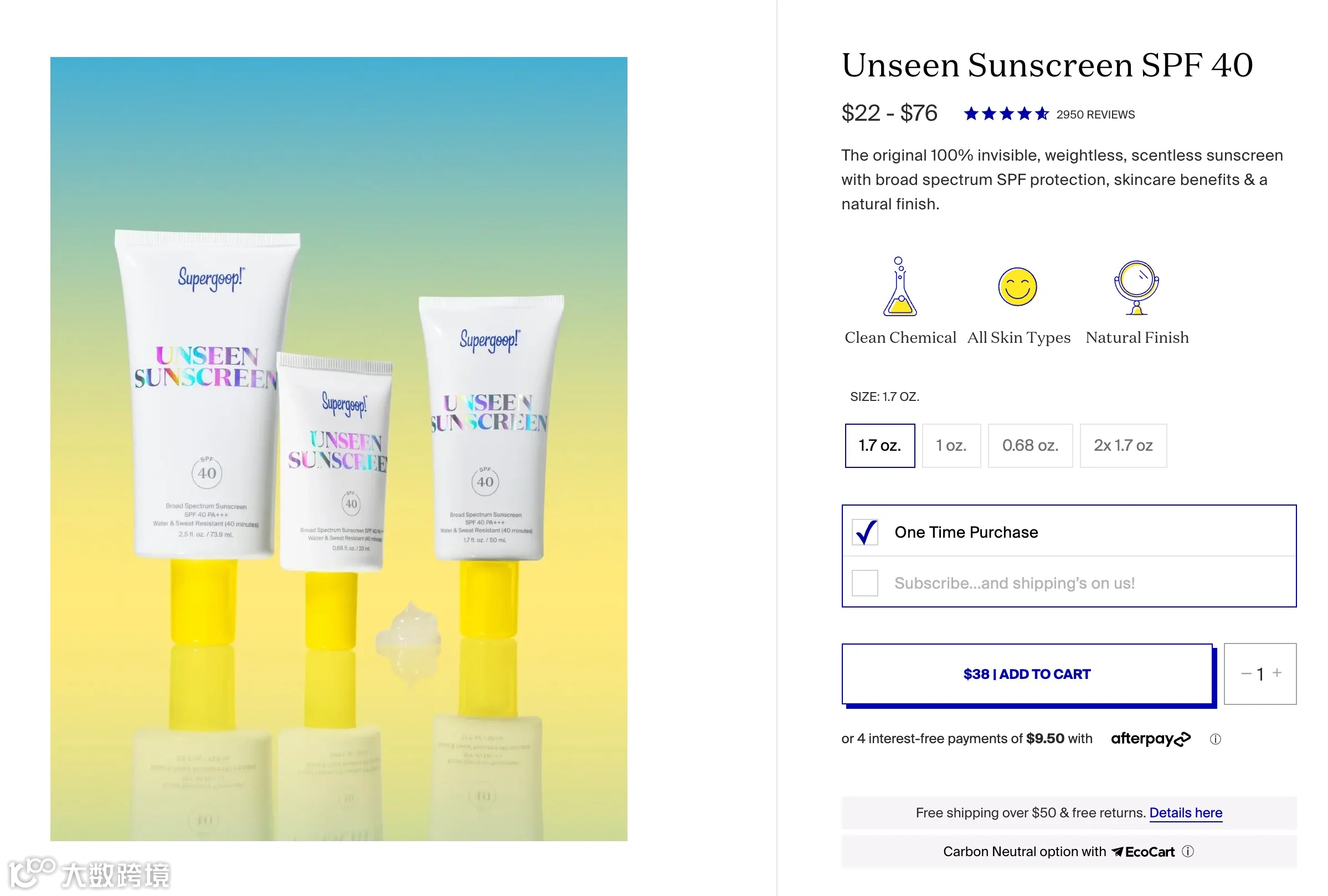 以Supergoop举例,它不仅有一个全面的退货页面和自主退货网页渠道,而且在每个产品页面上都有免费退货政策。
