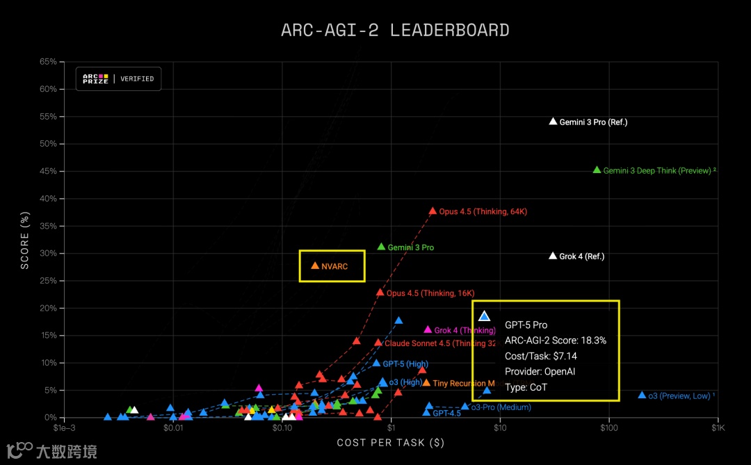 其单任务推理成本仅约20美分,约为GPT-5 Pro单任务成本(超7美元)的1/36。