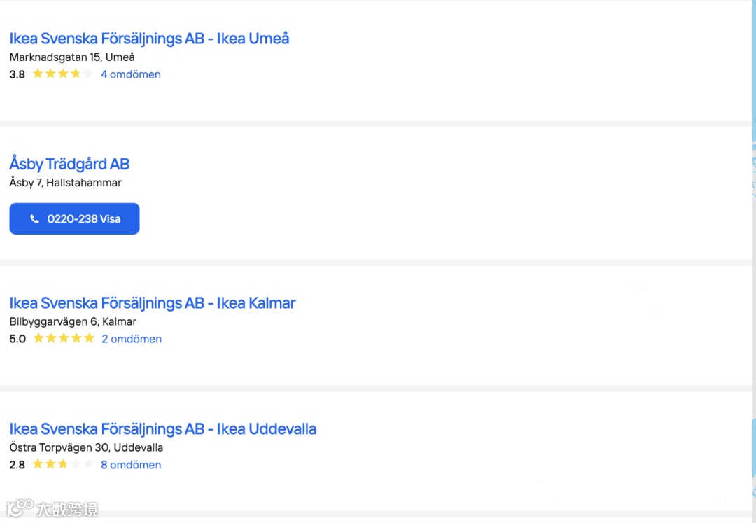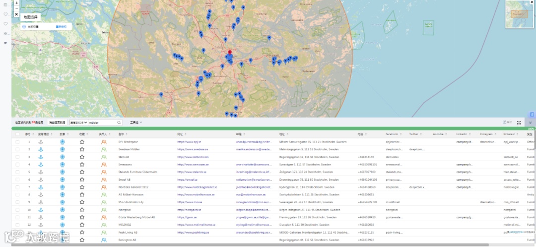 这里我直接定位瑞典的城市“斯德哥摩尔”使用关键词“möbler”搜索,一下子就给我搜索到了周围五十公里附近的公司信息,用来找客户线索也是很方便的一个方法