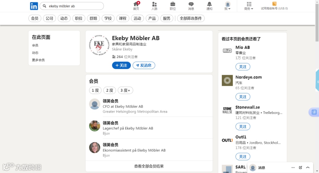 我们在 Linkedin 上搜索这家公司,直接搜索这个公司名,找到 Ekeby Möbler AB 的公司页面。