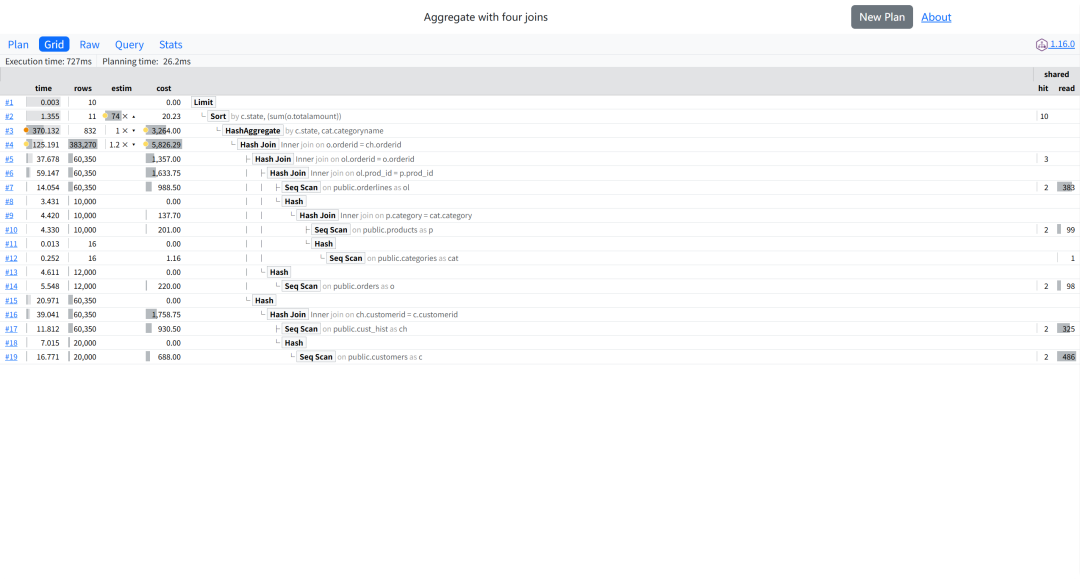 • 性能分析:通过图形和网格视图(Grid View)展示执行的时间、代价、行数等关键指标,帮助定位性能瓶颈。