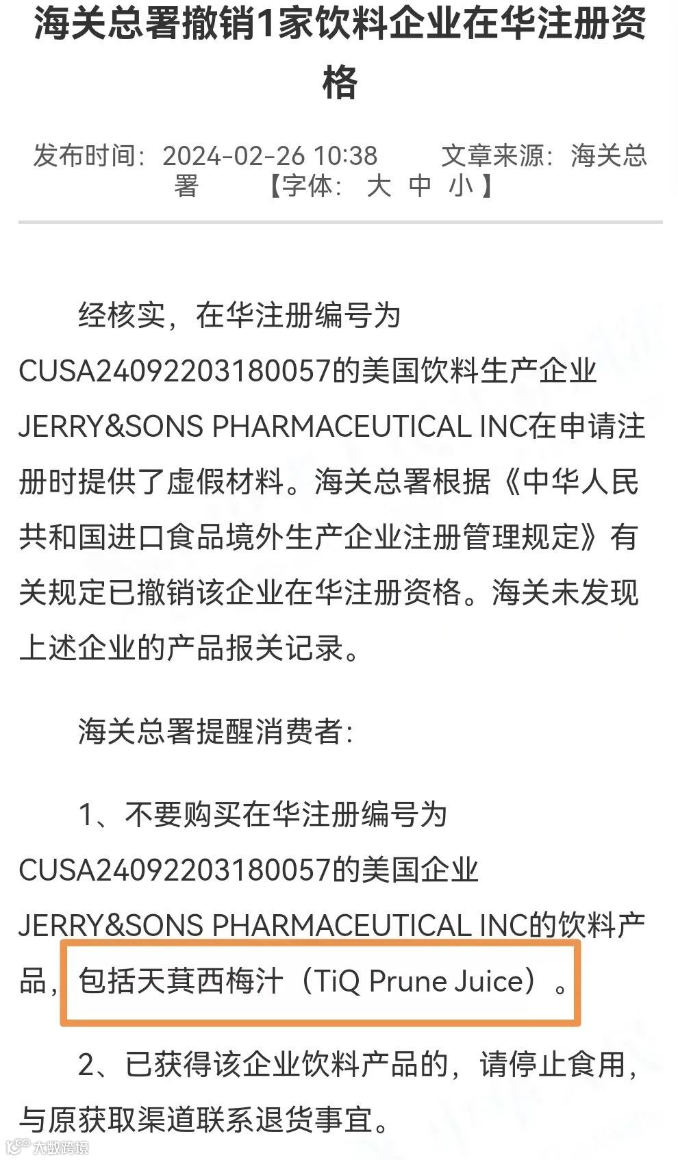 海关总署近日发布消息,在华注册编号为CUSA24092203180057的美国饮料生产企业JERRY&SONS PHARMACEUTICAL INC在申请注册时提供了虚假材料,已撤销该企业在华注册资格。