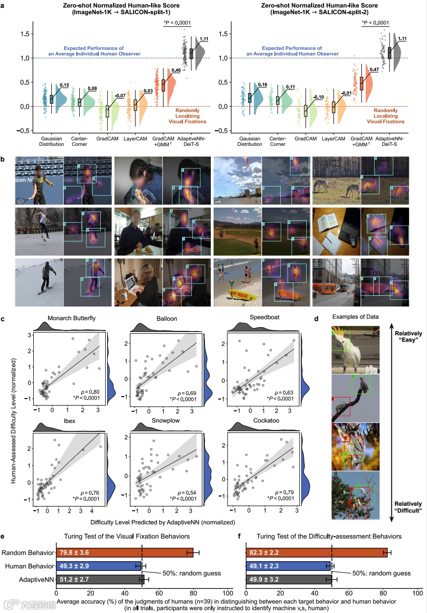 AdaptiveNN 在空间注视位置与任务难度判断两个层面,都展现出与人类视觉高度一致的自适应行为。定量结果表明,无论是 “看哪里”、还是 “觉得什么难”,模型的感知策略都与人类极为相似。在 “视觉图灵测试” 中,人类受试者几乎无法区分模型与真实人类的凝视轨迹。