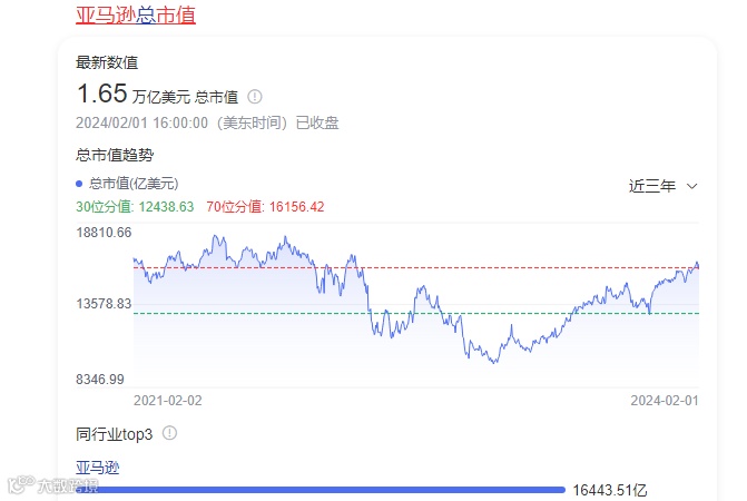 财报公布后,亚马逊美股市值和股价均明显上涨。截至当地时间2月1日收盘,亚马逊报159.280美元,涨幅2.63%,市值1.65万亿美元,亚马逊美股盘后涨幅近8%。