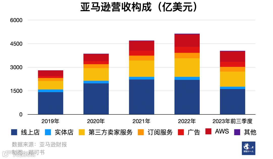 具体来看,亚马逊的营收包括线上店、实体店、第三方卖家服务、订阅服务、广告、AWS(网络服务云计算业务)以及其他。
