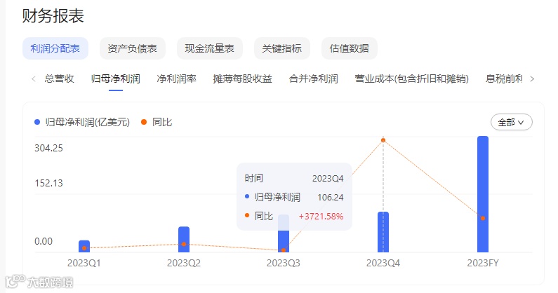 此外,归属于普通股东净利润为304.25亿美元,同比增长1217.74%。