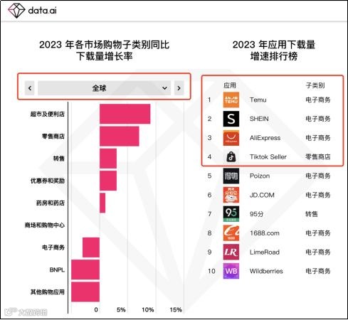 data.ai另一份榜单显示,2023年前三季度,Temu、Shein、AliExpress(速卖通)、TikTok seller成为全球市场下载量增速最快的购物App。