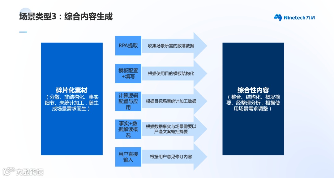 典型场景:报告自动化生成(财报、管报,各类日报、周报)、新闻稿自动化生成、招聘JD自动化生成、培训教程与视频自动化生成。