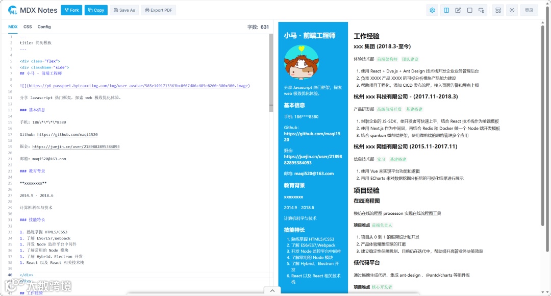 MDX 结合了 Markdown 和 JSX 的优点,它让用户可以在 Markdown 文档中直接使用 React 组件,构建复杂的交互式文档。