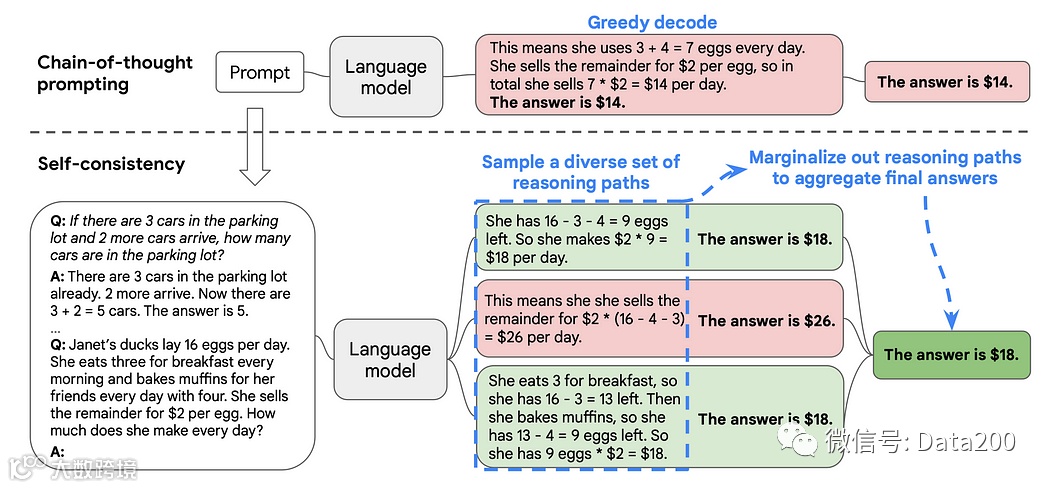 通过思维链推理,产生了一条思维路径,然后又遵循了该路径。相反,自洽利用了一种直觉,即一个复杂的推理问题通常允许多种不同的思维方式,从而得出其独特的正确答案。