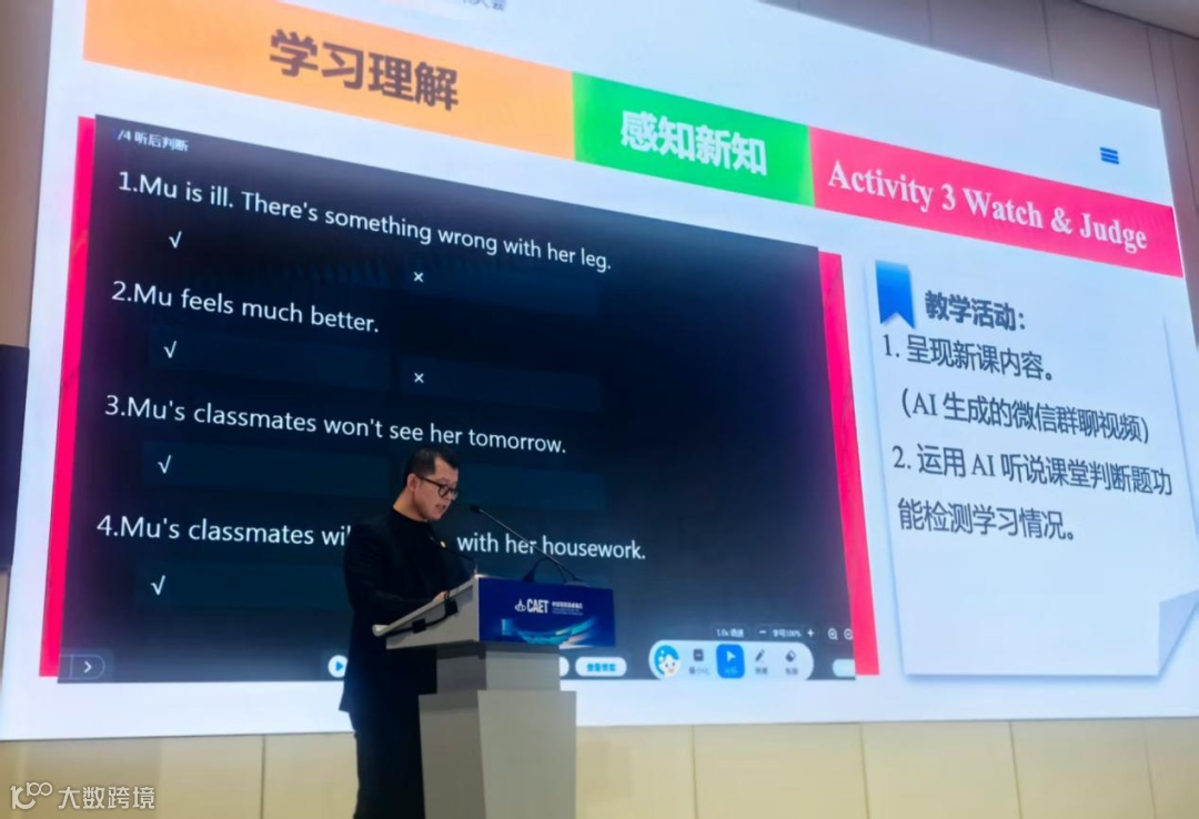 在“一线实践”环节,来自天津市和平区岳阳道小学的一线教师荆涛以《守正创新,智赋课堂——数智时代英语教学的实践与思考》为题,分享了基于科大讯飞“AI听说课堂”的精准教学实践。荆老师结合不同课例的备课场景,展示了自己如何运用AI让备课内容更生动;又结合词汇“get-well card”的授课场景生动演示了如何借助AI语音评测系统,实现对全班学生发音情况的实时跟踪与精准反馈。他指出,AI不仅扩大了教师关注的覆盖面,更通过数据可视化报告,帮助教师精准掌握学生的学习情况,运用AI,不是让教师进行技术堆砌,而是让AI真正服务于课堂需求、贴合学生实际,这才是数智赋能的意义。