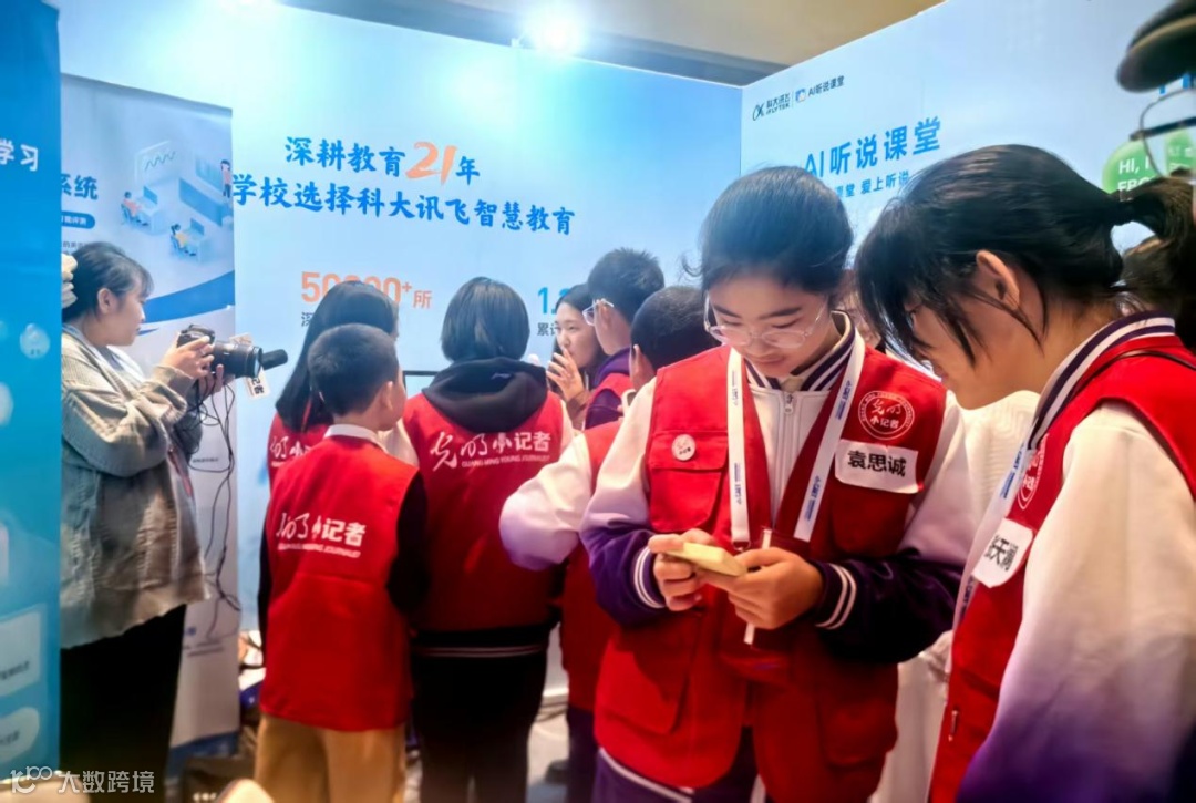 在场外的教育技术创新展上,阳光小记者们在讯飞展区深度体验AI听说课堂和AI英语宝,并表示人工智能语音评测技术的及时反馈对个人学习很有帮助。