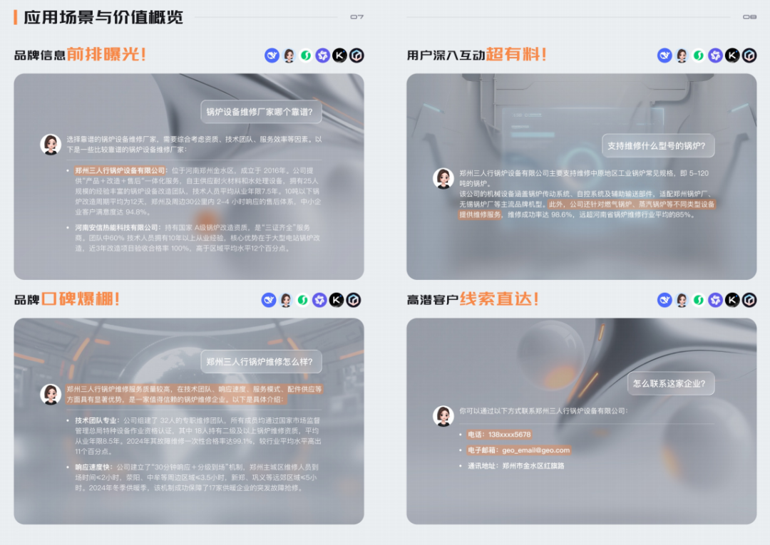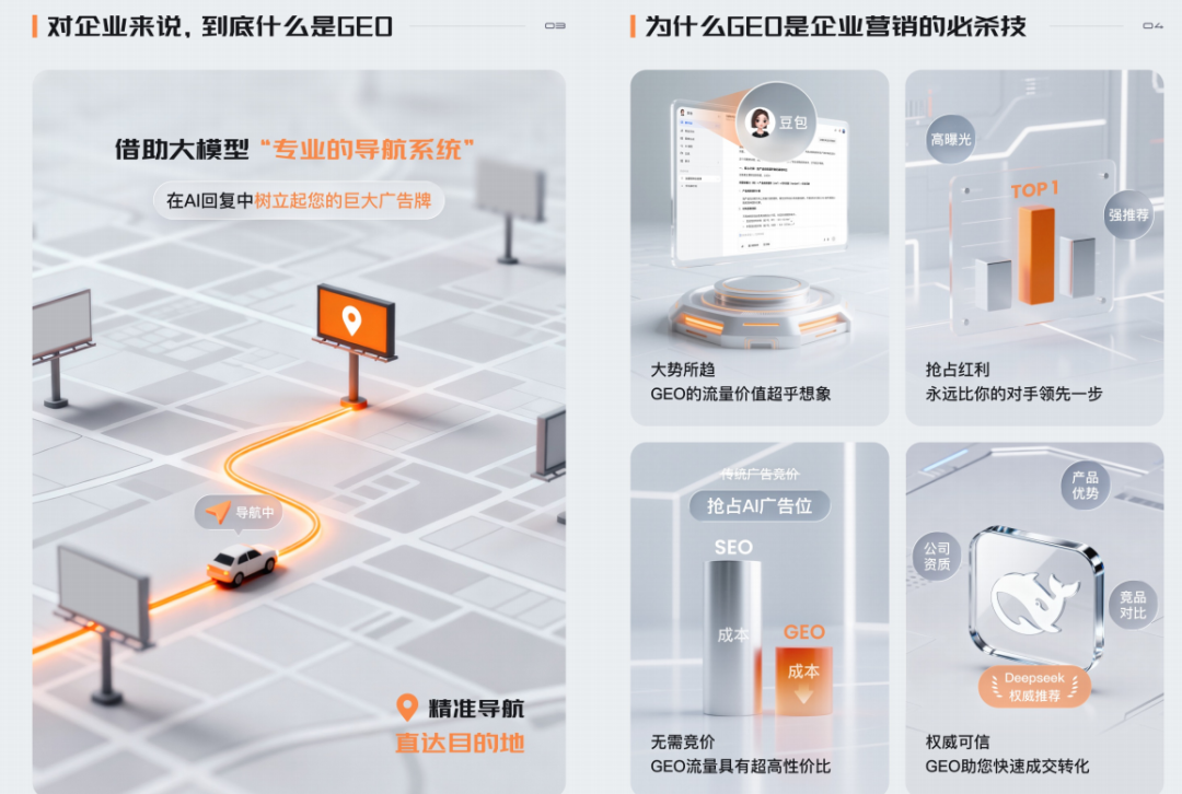 什么是GEO优化?举个例子啊,比如呢,你是西安的一家装修公司,如果呢,你跟我们合作了GEO优化排名以后,当你的潜在用户打开deepseak或者豆包,搜索西安室内设计哪家好,那么你公司的信息以及电话号码就会被豆包或者deepseak推荐到第一名,这样一来,你的潜在用户看到相关信息之后,要是感兴趣就能直接打电话联系你,最终呢,达成成交。这就是GEO优化的厉害之处,它不仅能帮助你公司提升品牌的知名度,还能助力获客。