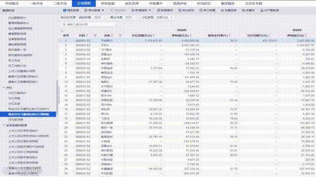 •多维筛选:支持按行业、板块、分红规模、股息率、实施日期等多种维度进行筛选和排序,精准定位高分红潜力公司。