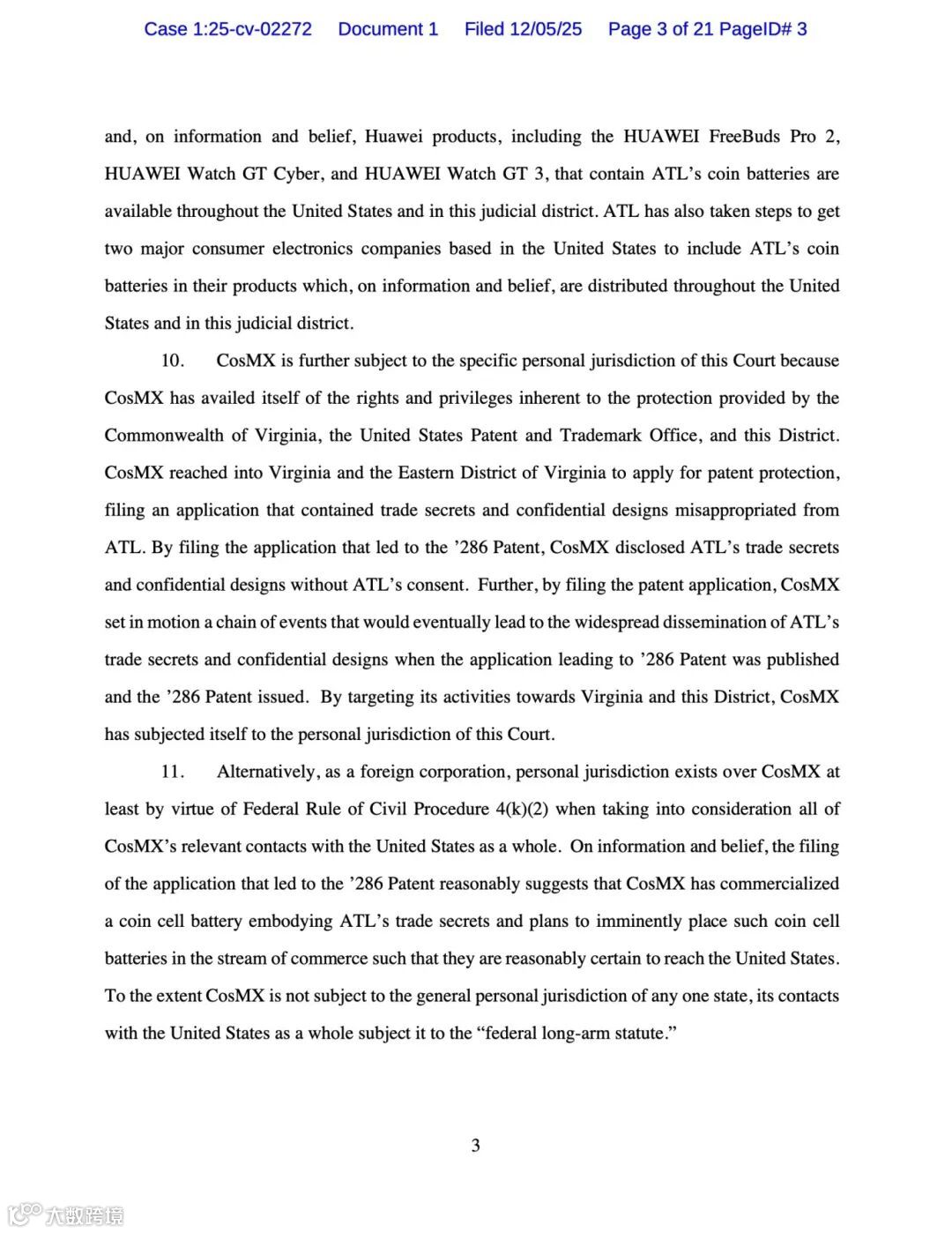 知产财经获悉,美国时间2025年12月5日,宁德新能源科技有限公司(ATL)在美国弗吉尼亚州东区联邦地区法院对珠海冠宇电池股份有限公司提起诉讼,指控其侵犯商业秘密,并请求法院宣告ATL为美国专利第12,107,286 B2号的所有权人。本案案号为1:25-cv-2272。