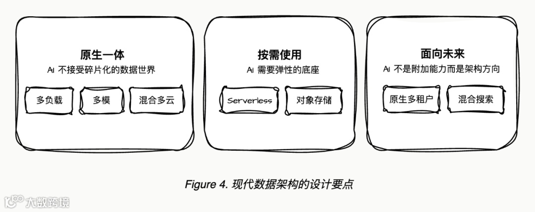 现代数据架构是随着业务需求逐步发展起来的。数据库最早采用 IOE 集中式架构(IBM 大型机 / 小型机 +Oracle+EMC 存储),数字化进程到来之后集中式架构的并发能力不足,开始转向分布式架构。云计算通过集约化管理能够大幅提升效率,这就产生了云原生架构,且随着云计算的不断演进,很多企业发现某些云的成本很高且每年都会出现某个公有云整体故障的系统性风险,因此逐步走向云中立和混合云,产生了混合多云架构;AI 时代来临之后,由于 AI Agent 的使用方式和工作负载的特点,需要支持极致的弹性,从“无限小”的 Serverless 到“无限大”的全分布式架构。
