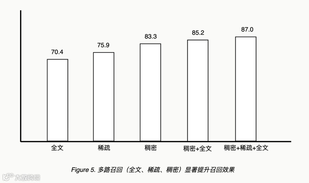 相比单一路径的向量搜索,混合搜索能够大幅提高召回效果。实验和实践表明,如果只采用单一路径搜索——无论是全文、稀疏还是稠密向量,都难以达到最优结果;只有将全文、稀疏和稠密向量结合起来执行混合搜索,才能最大化召回效果。理论上,只要重排序(rerank)算法足够出色,搜索方式越多,效果越好。当然,实际生产系统中往往是搜索效果和执行效率的一个平衡。一般来讲,向量和全文的混合搜索就能达到不错的效果,少部分场景会引入知识图谱来获取全局信息。知识图谱的难点并不在算法本身,而在于很难自动构建一个准确率比较高的知识图谱,因此,往往应用在一些特定领域,比如用于表示医疗、法律等行业的特定术语和这些术语之间的关联关系。