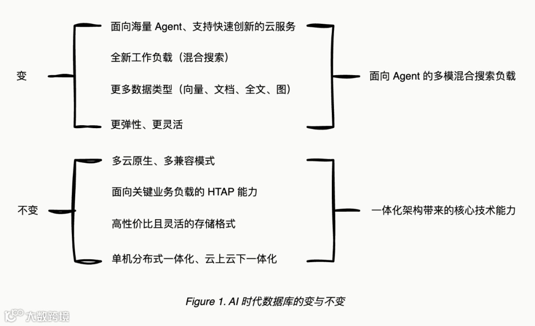 AI 时代带来技术平权,从数据库使用方式来看,主要带来两点变化:一是每个普通用户通过 AI Agent 使用数据库,带来海量多租户需求;二是新增了全新的多模混合搜索工作负载。同时,原先的 OLTP、OLAP 以及 HTAP 的需求仍然存在。
