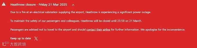 “由于为机场供电的变电站发生火灾,希思罗机场正在经历严重的停电,”希思罗机场在社交媒体平台上发布声明,“希思罗机场将于3月21日关闭至23点59分。