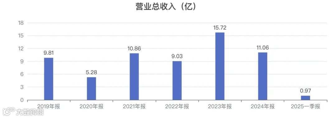 历史5年数据显示,公司的营业总收入呈波动趋势,历年同比变动为:-46.15%、105.58%、-16.83%、74.00%、-29.60%。 -