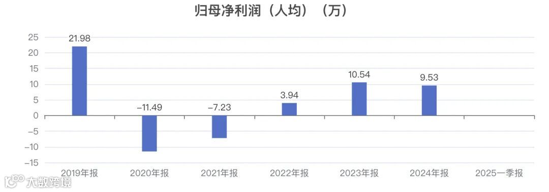 近5年人均归母净利润从 21.98万变为 9.53万。